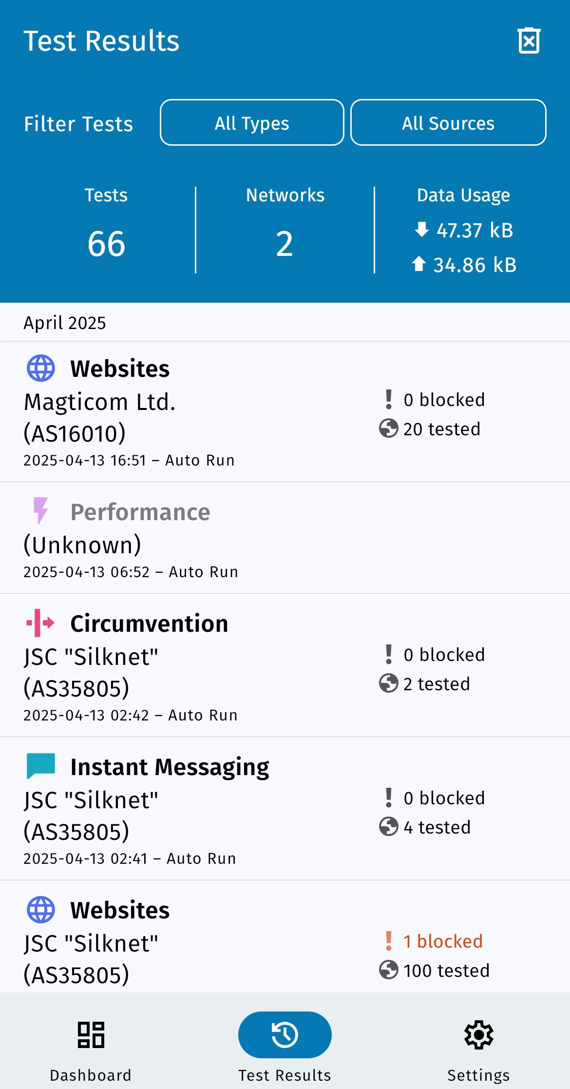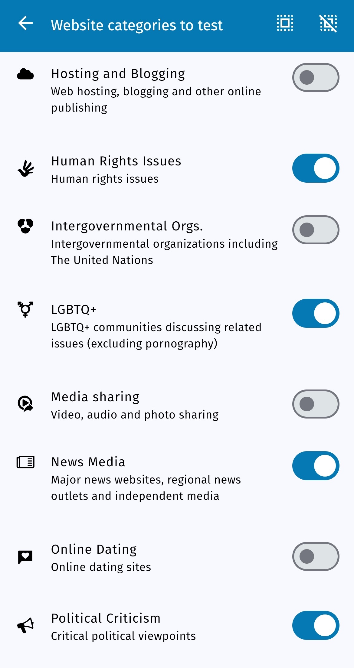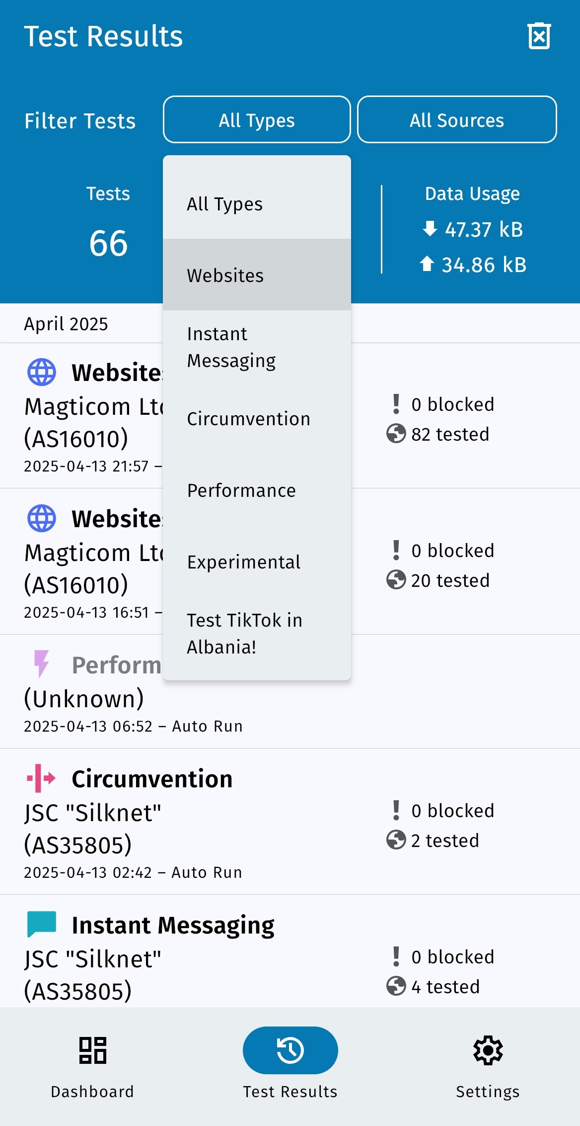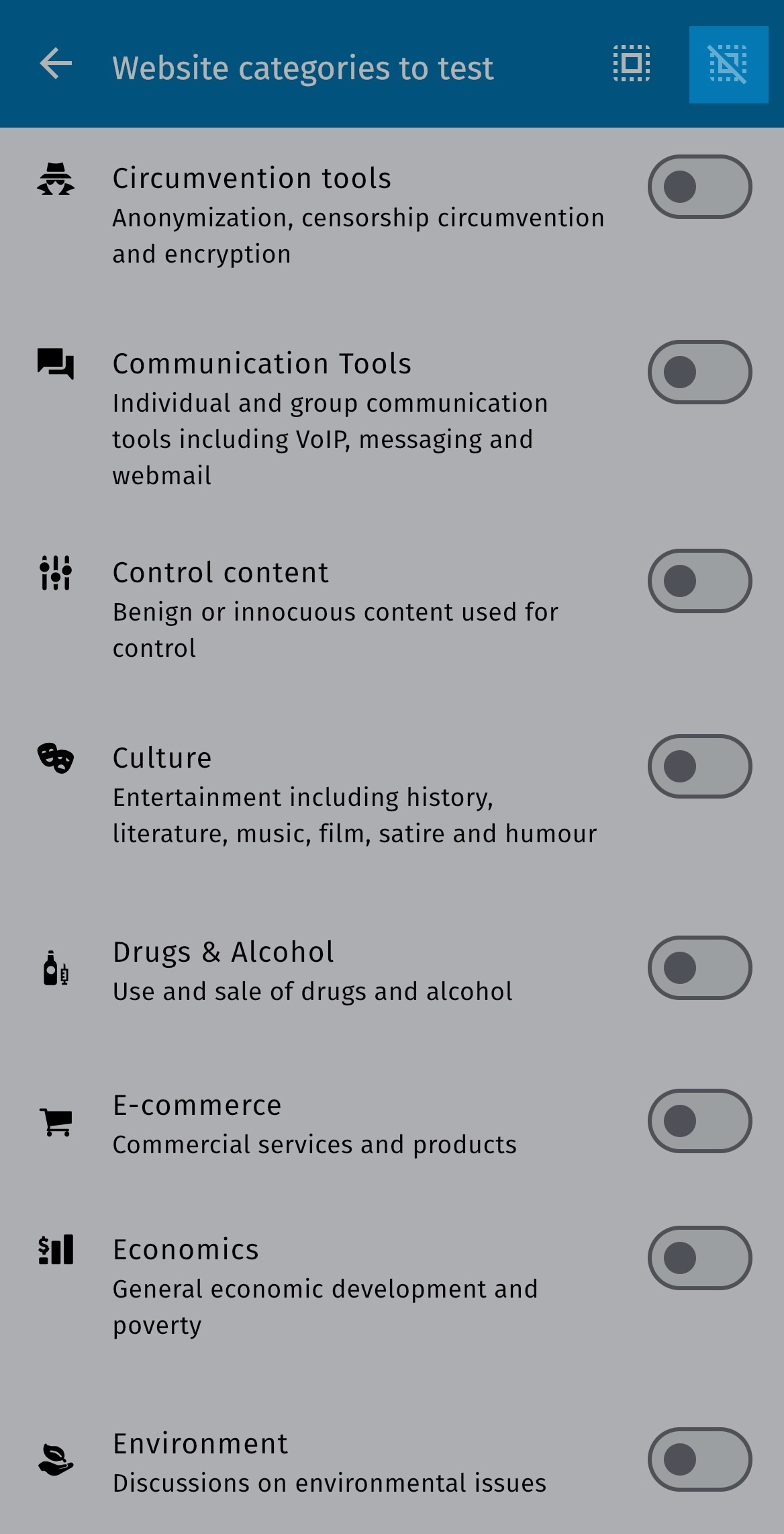 With automated OONI Probe testing, you can regularly contribute censorship measurements (without having to do anything), enabling the internet freedom community to monitor and detect censorship events in your country over time. If you are concerned about traffic consumption or risks connected with regular testing of specific websites categories, you can limit the types of tests to be ran through the Run menu or limit list of categories to be tested through Test options section of OONI Probe settings. You can also limit types of tests to be run automatically through the Dashboard menu of the app.