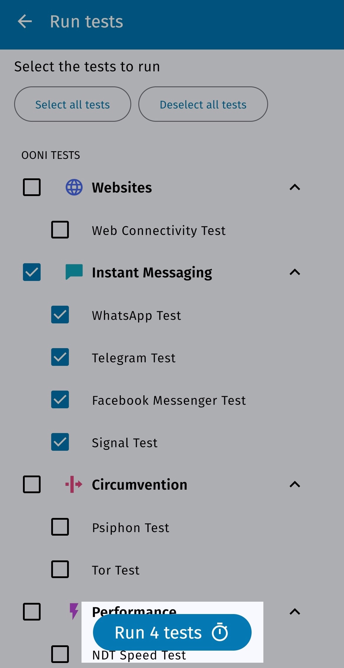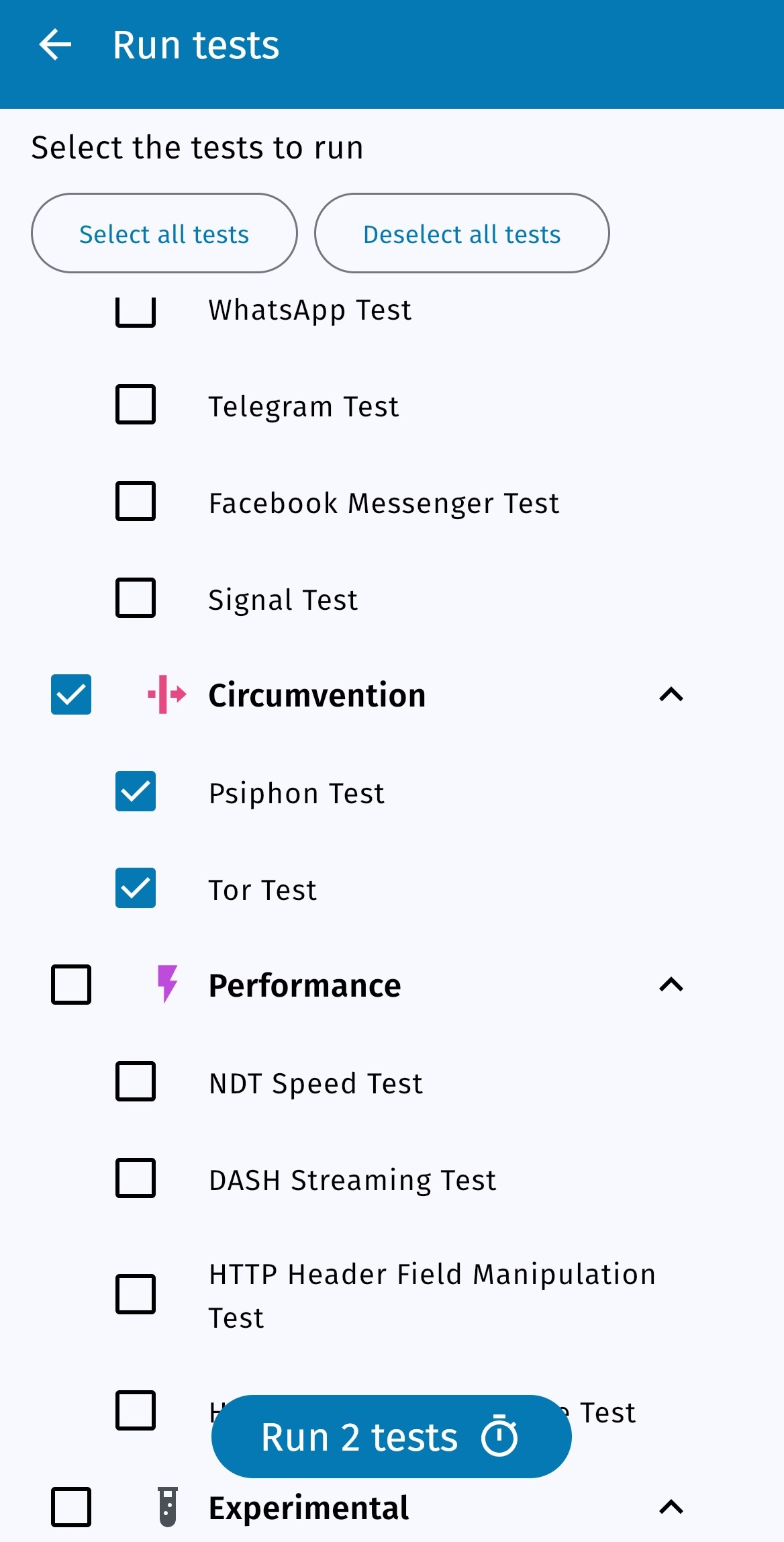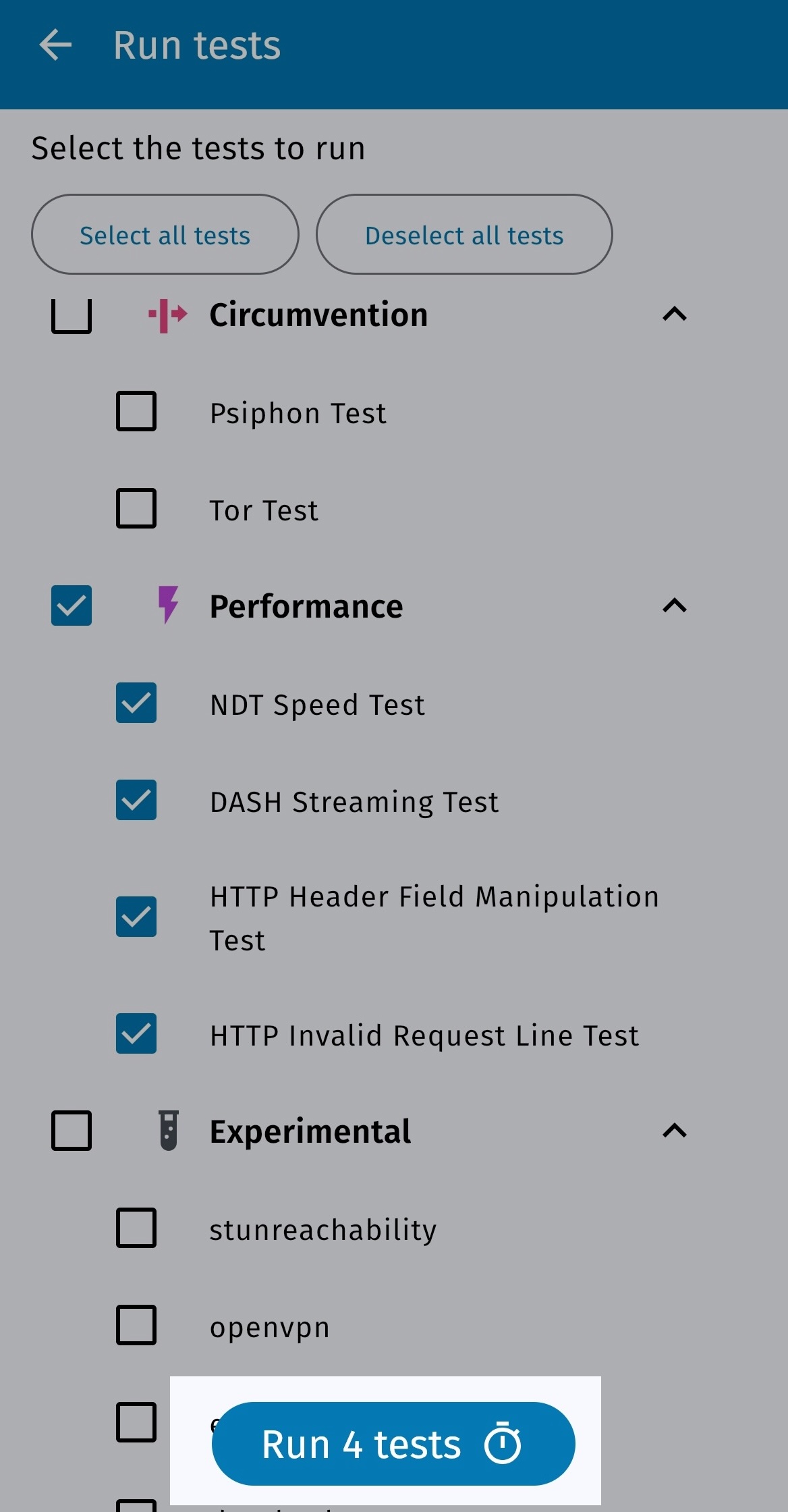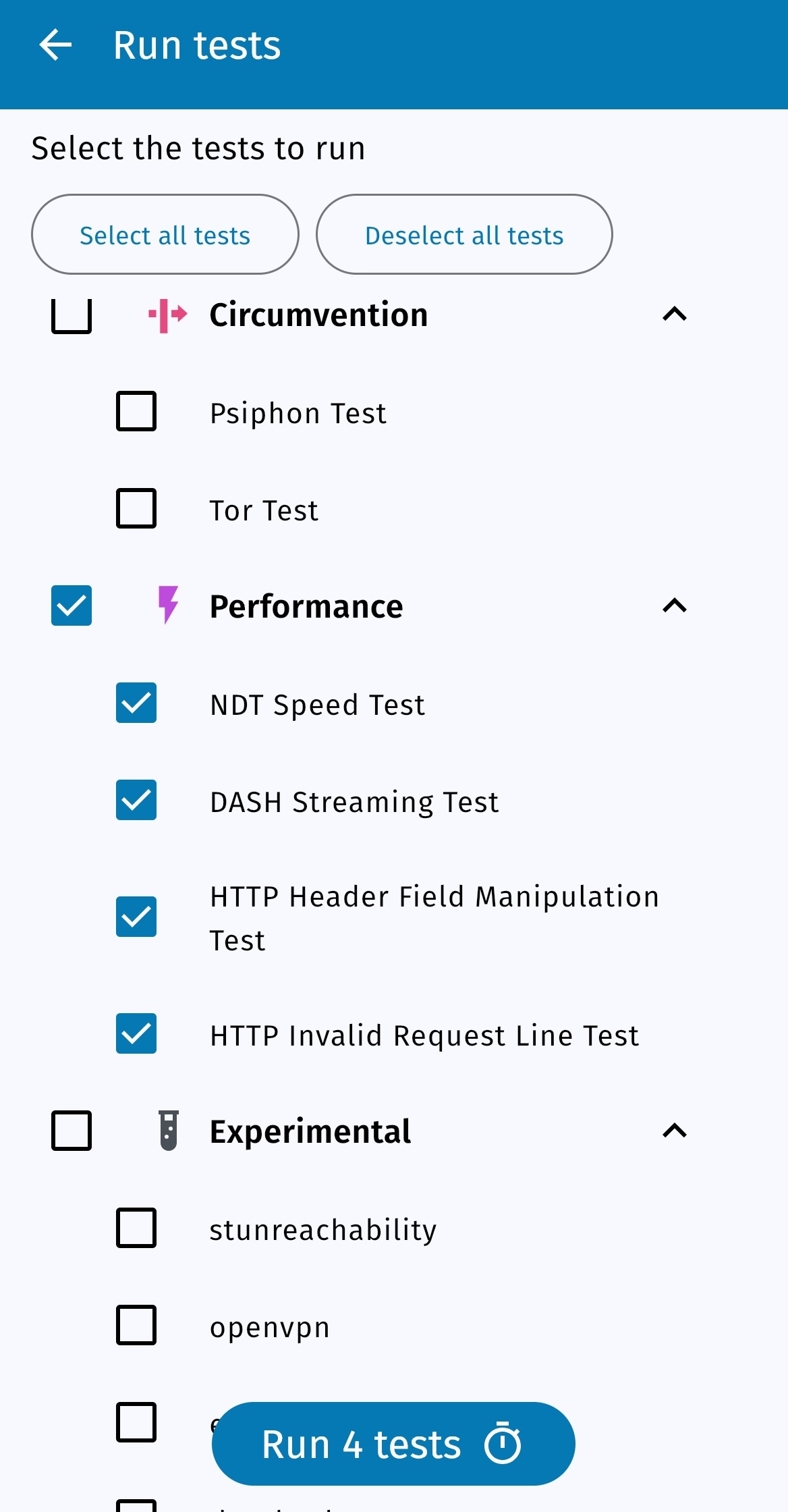 Once you tap “Run”, you will see a checklist with all tests available in the current version of the app. Tap “Select all tests” to run all available tests.