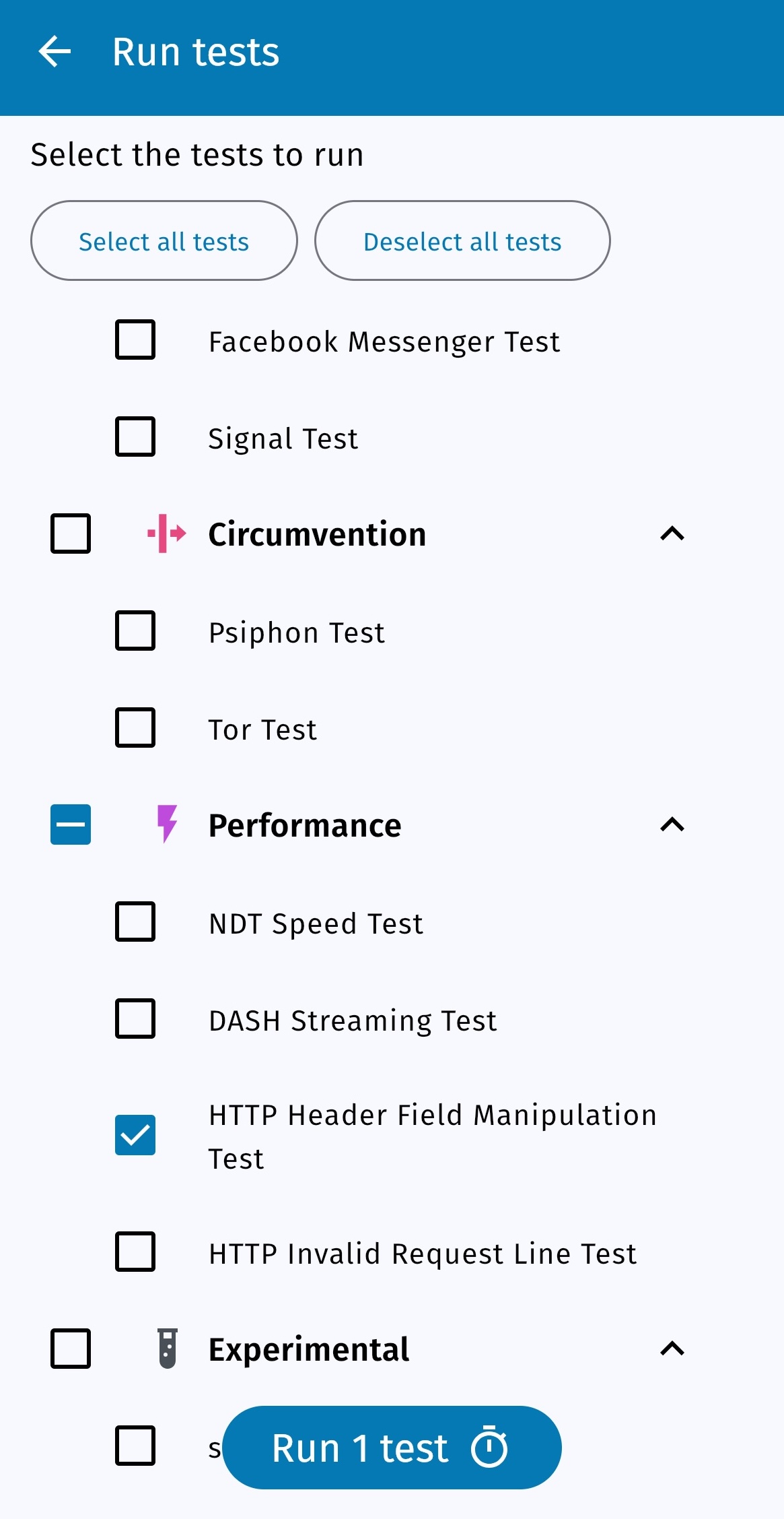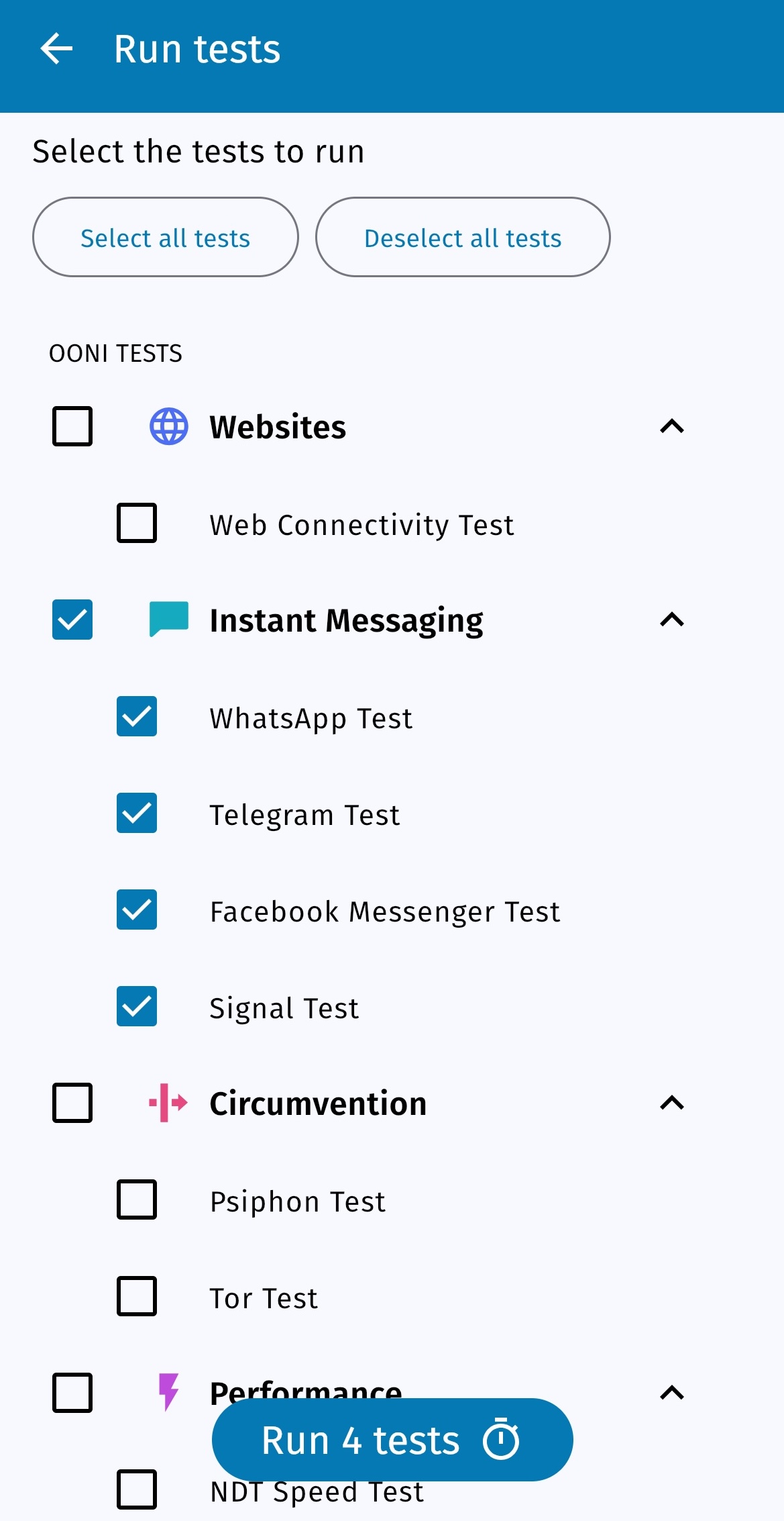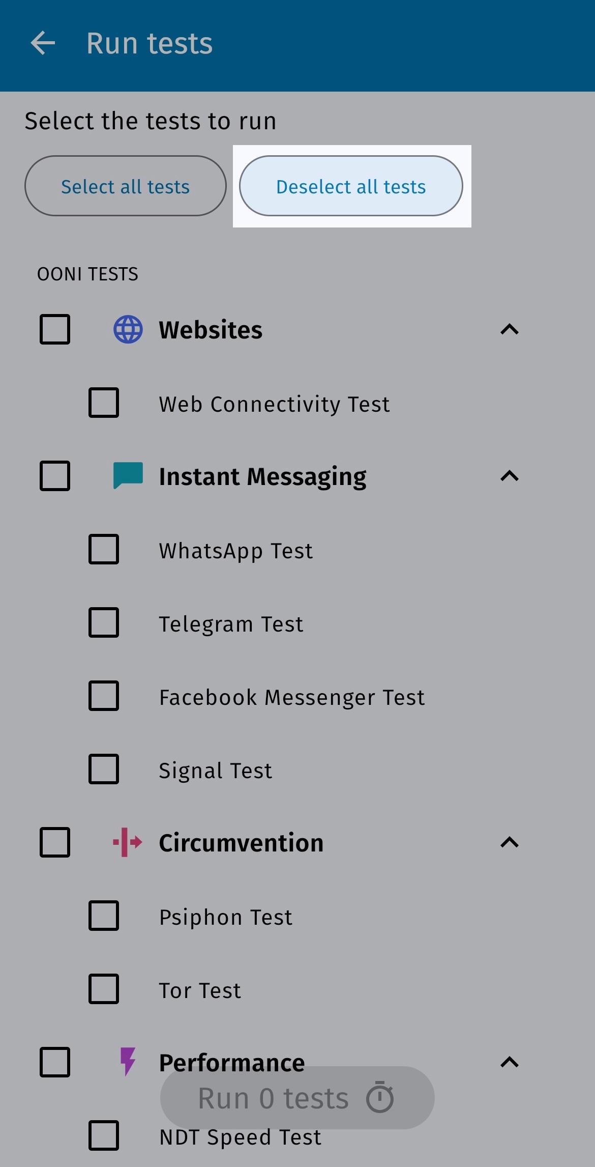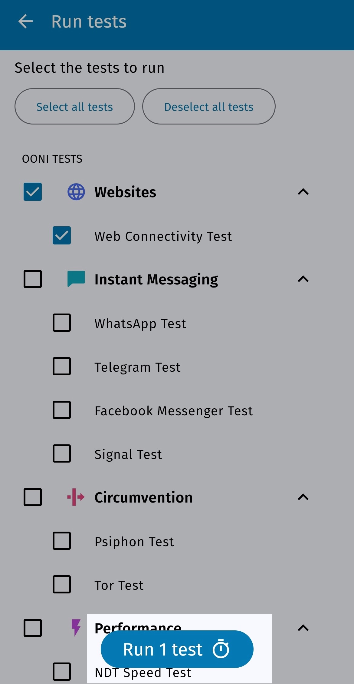 Once you tap “Run”, you will see a checklist with all tests available in the current version of the app. Tap “Select all tests” to run all available tests.