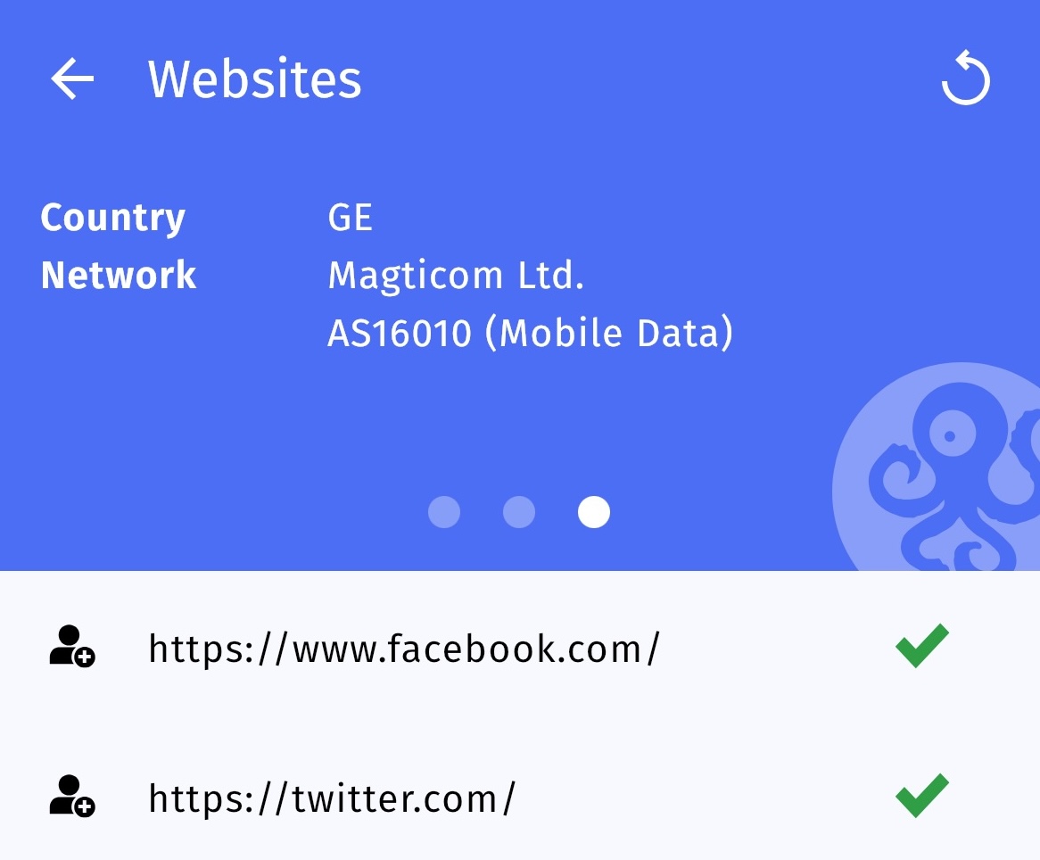 - Websites card. Includes OONI’s Web Connectivity test which measures the blocking of websites.