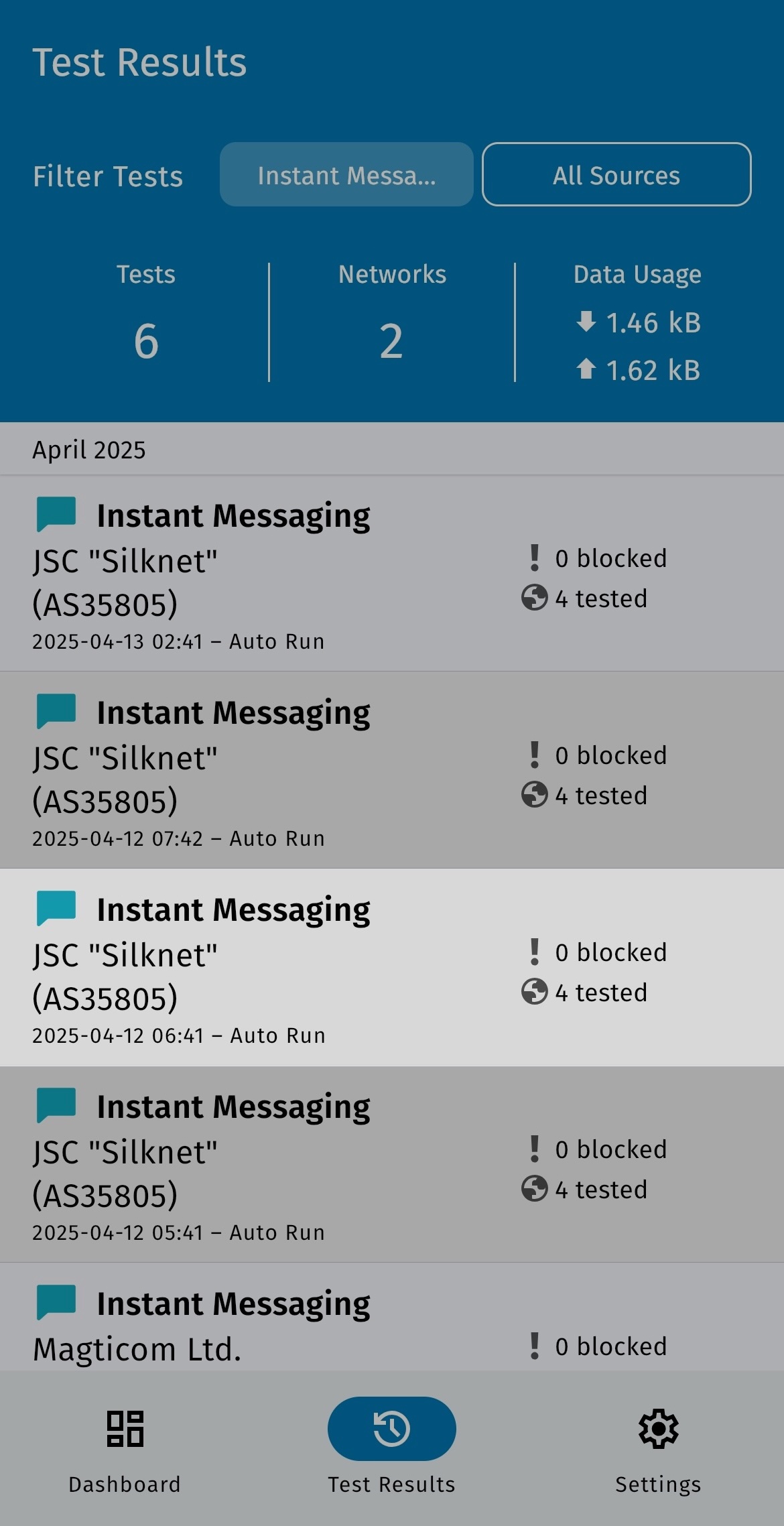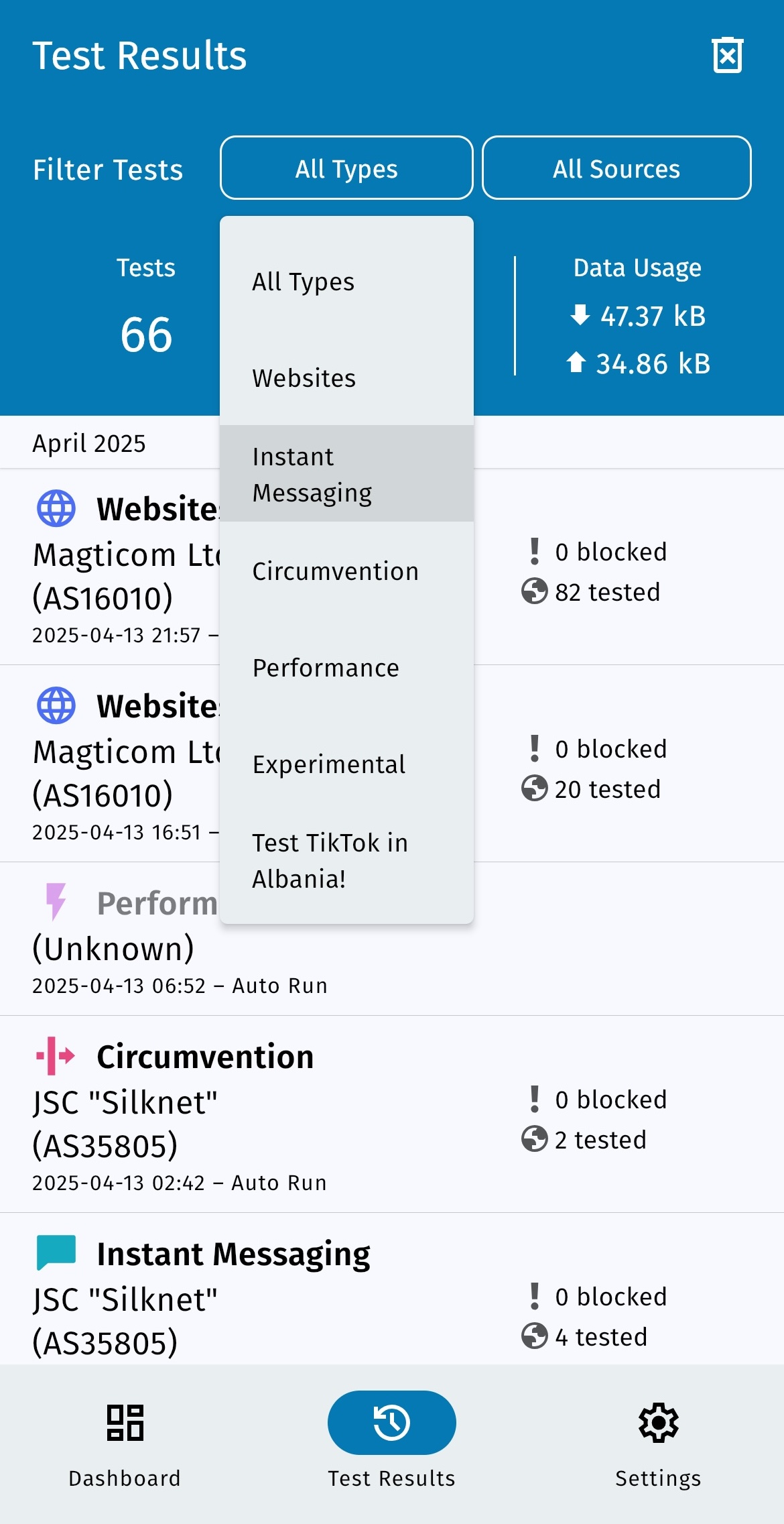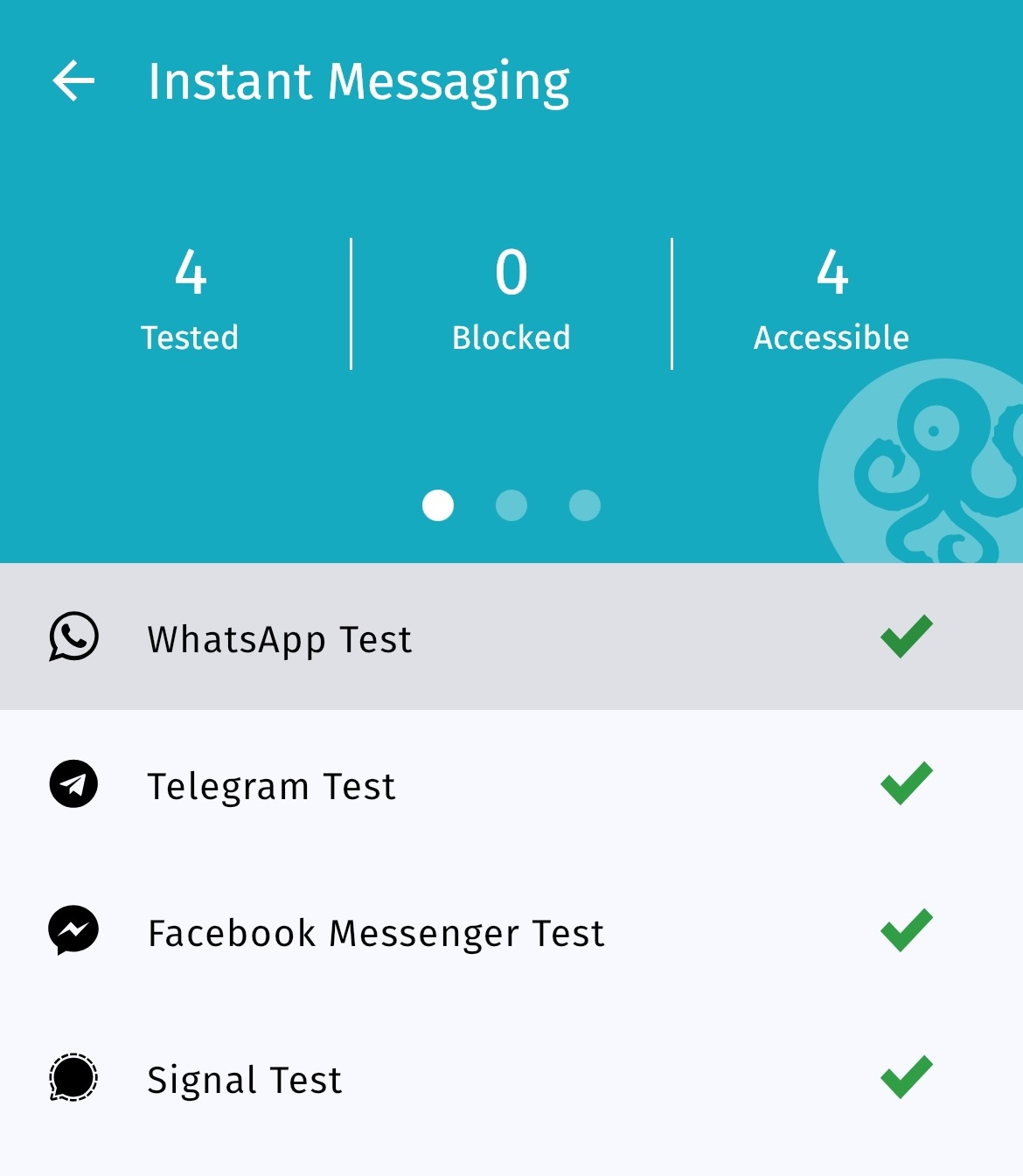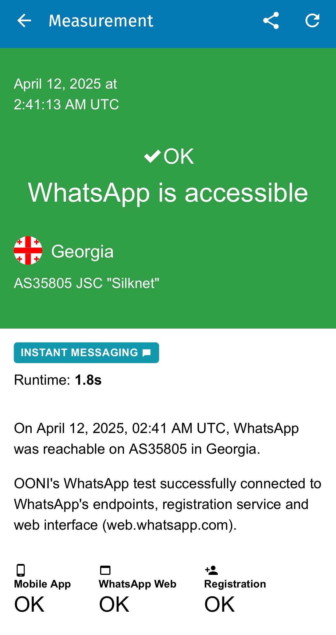 - Instant Messaging card. Includes OONI’s WhatsApp, Facebook Messenger, Telegram, and Signal tests which check if these apps are blocked.
