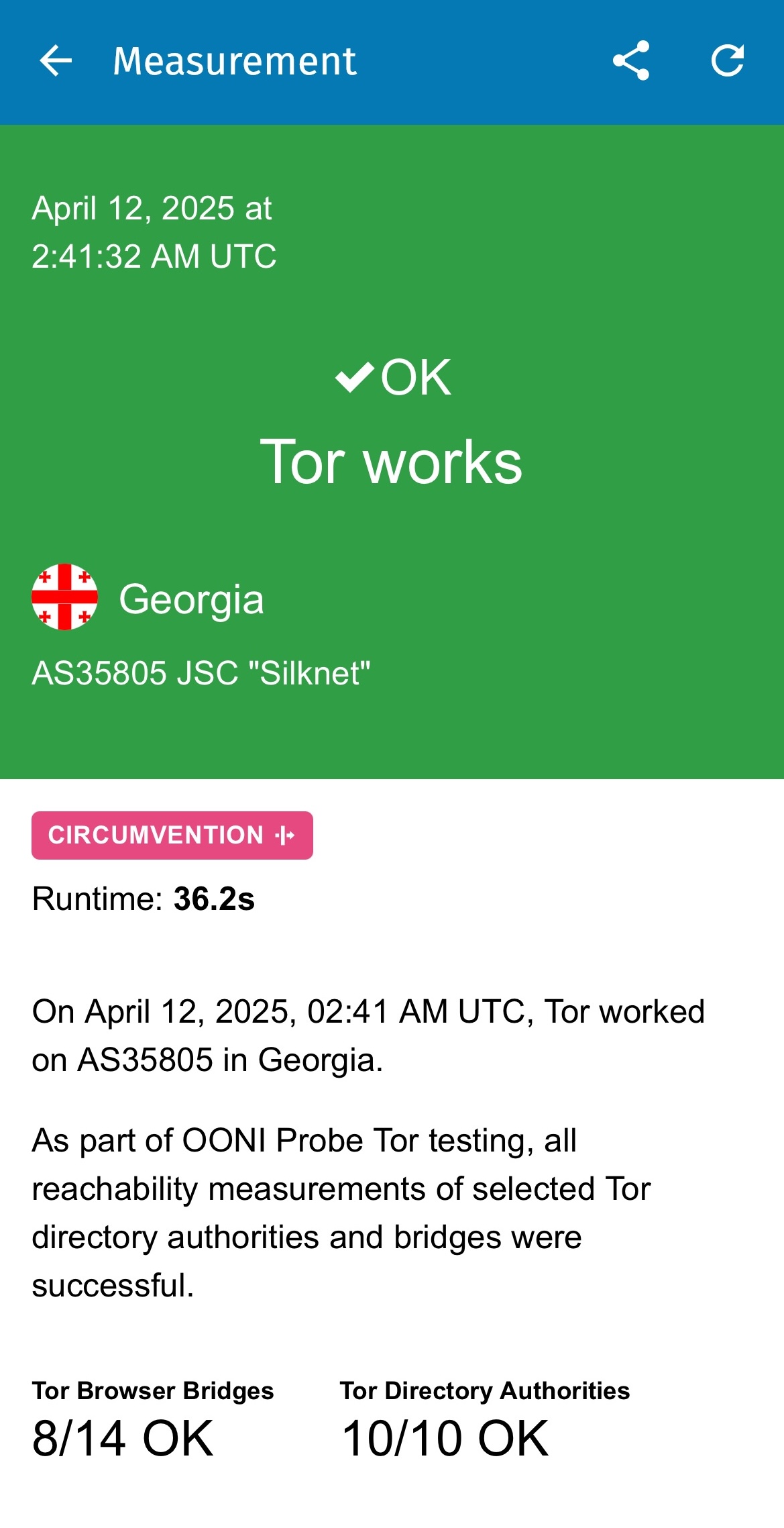 In this case, we can see that Tor was reachable when tested on JSC Silknet (AS35805) on 12th April 2025 at 10:41 UTC. This conclusion is reached because OONI’s Tor test was able to successfully connect to most of the default Tor bridges and to all Tor directory authorities.