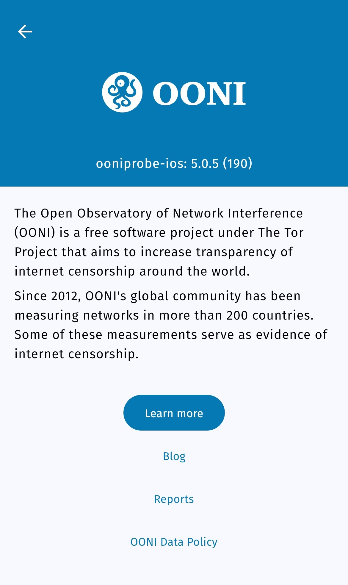 Step 2. Tap the Learn more button to access the OONI website and learn more about our project.