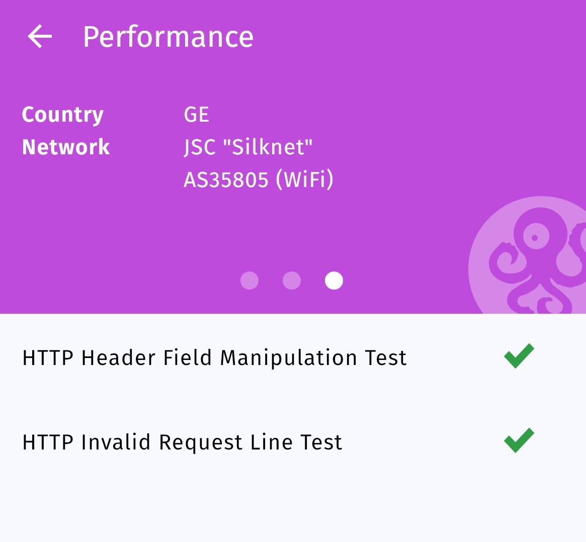 - Performance card. Includes the NDT speed test, the DASH video streaming performance test, and OONI’s middlebox tests (HTTP Header Field Manipulation test and HTTP Invalid Request Line test).