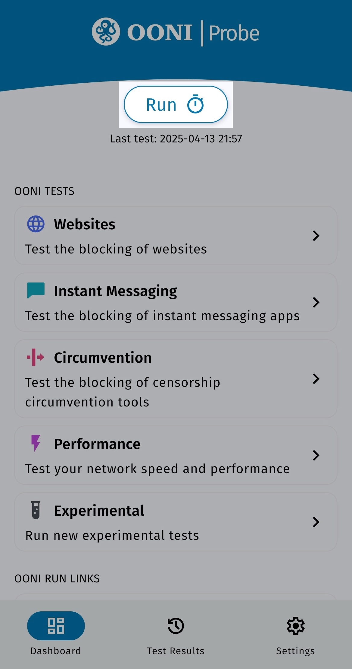 Step 1. Tap the Run button in the Dashboard of your OONI Probe mobile app.