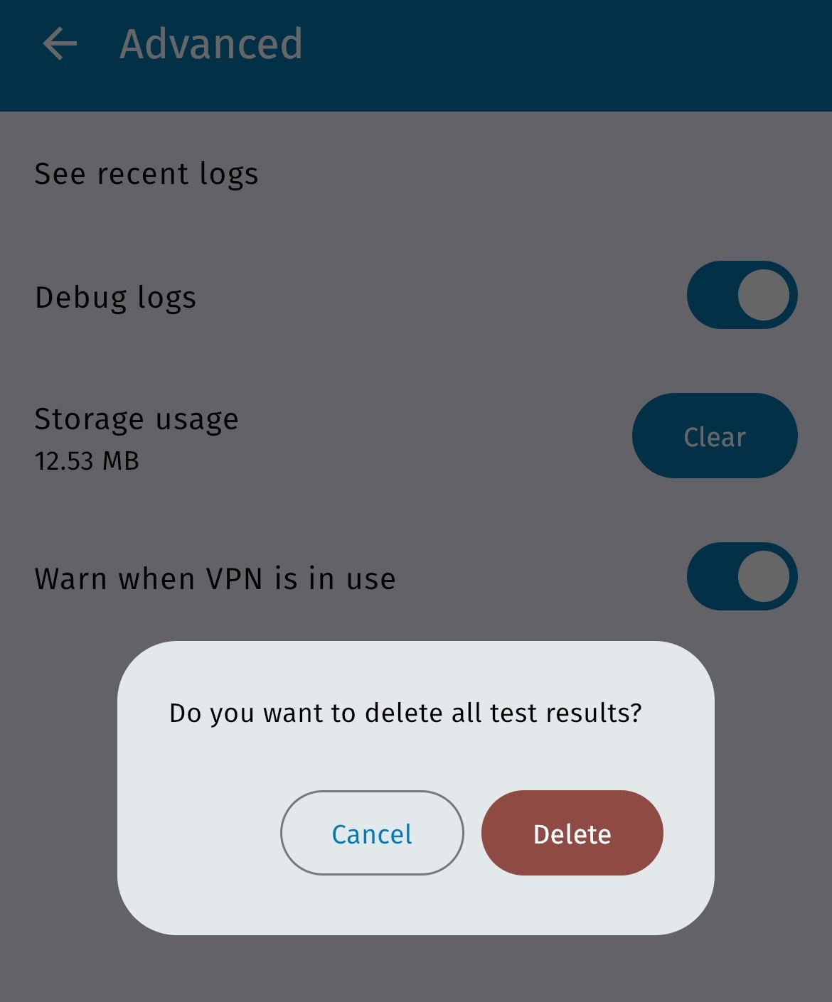 This will prompt the following pop-up window, asking if you would like to delete all of your OONI Probe test results. All of your OONI Probe test results have already been published on OONI Explorer (unless you opted-out of the publication of results in the Test options of the settings).