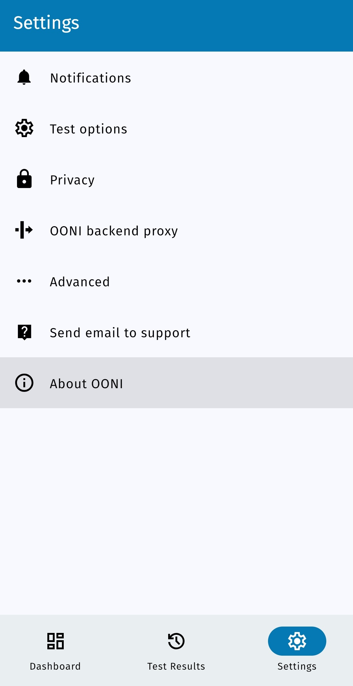 Step 1. Tap About OONI through the settings of your OONI Probe app.